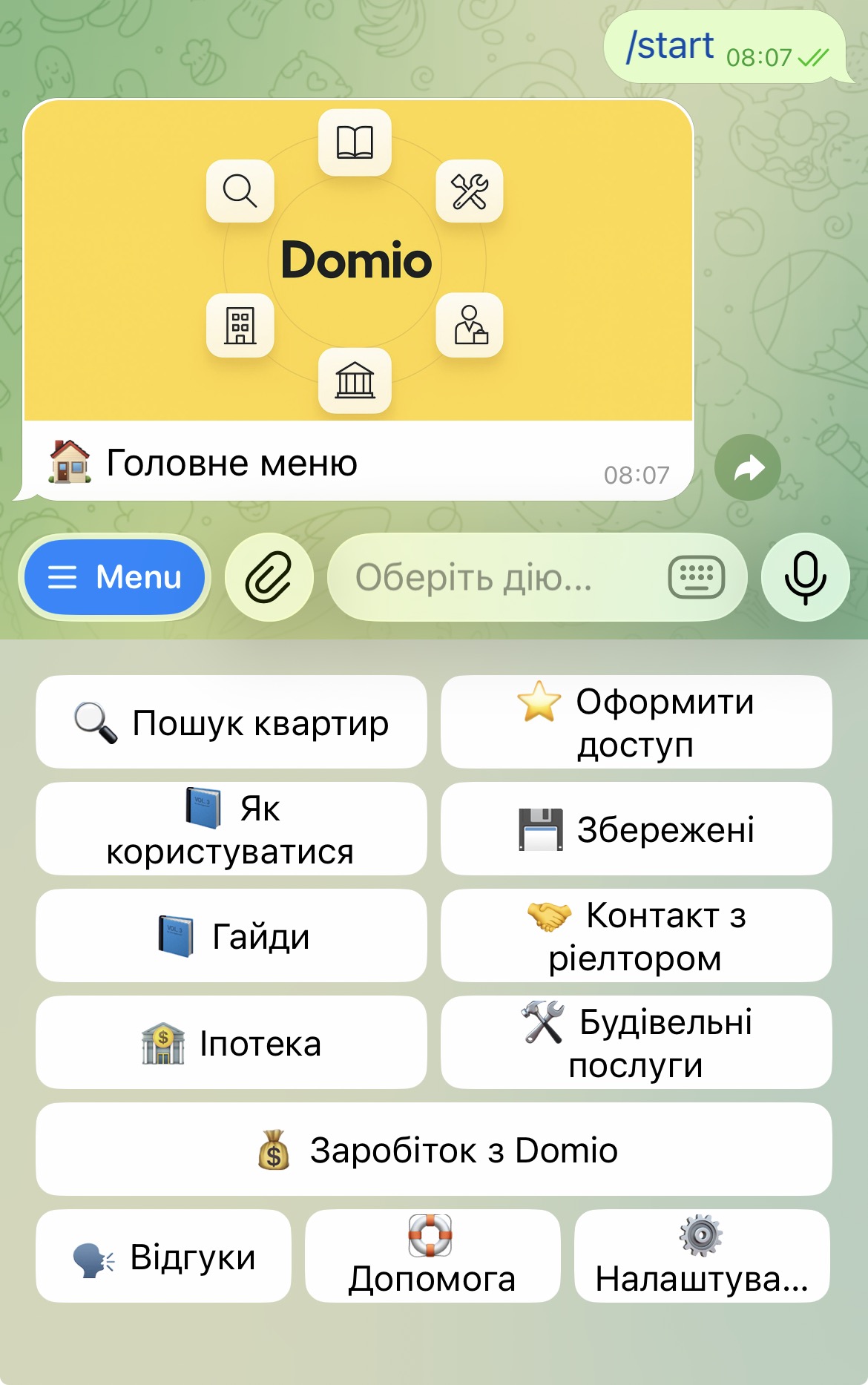 Відкрийте чат-бот Domio у Telegram (сервіс доступний 24/7 на вашому смартфоні).
